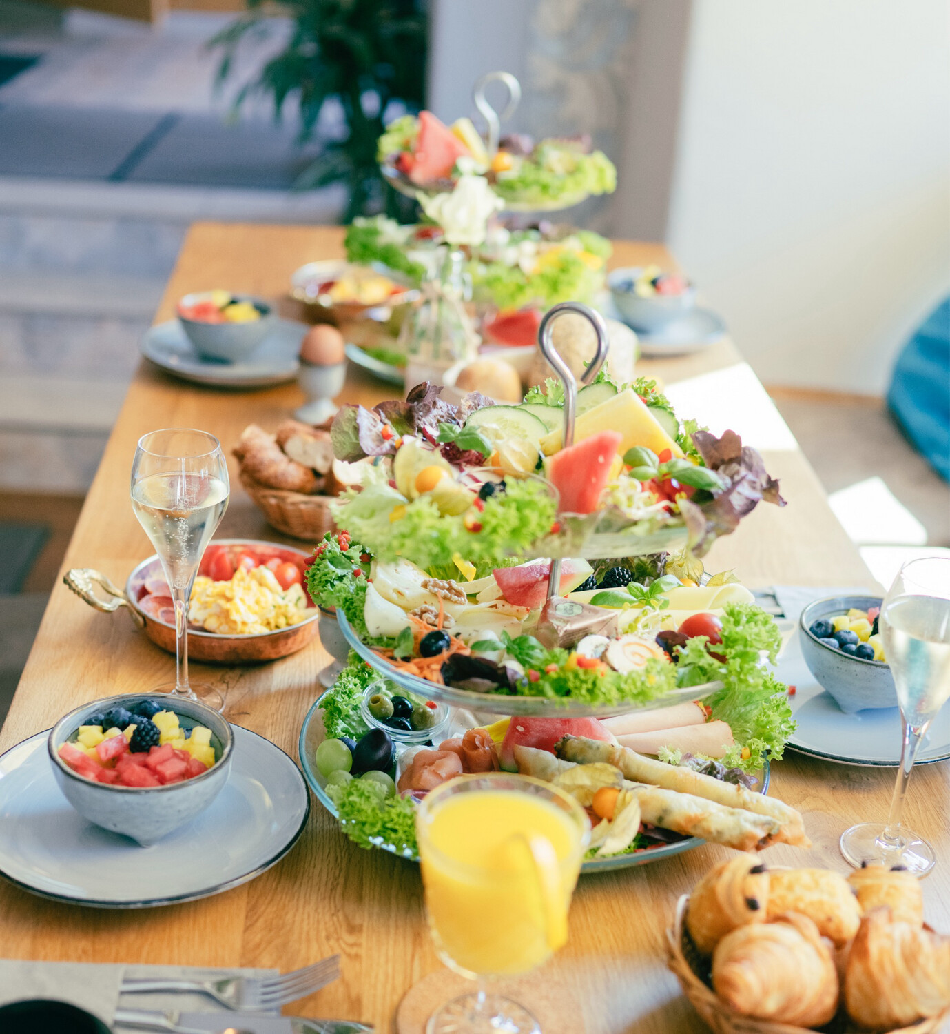Diverse Käsesorten, Frischkäse, Putenbrust, Salami, Marmelade, Forelle, Honig, serviert mit frischem Obst und Gemüse auf der Etagère.